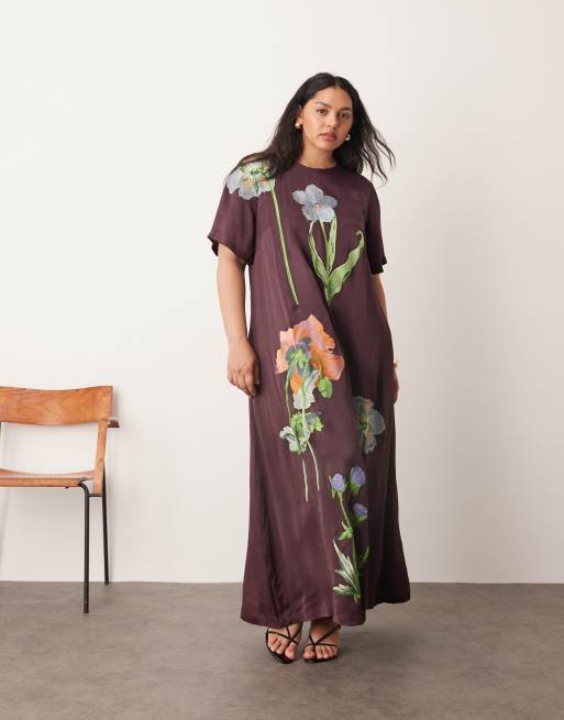 ARRANGE Curve – Chokladbrun t-shirtklänning i maxilängd med blommigt broderi av satin