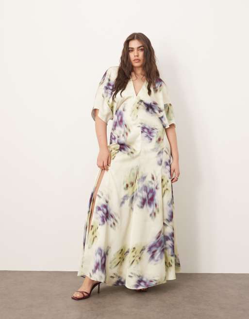 ARRANGE Curve – Maxiklänning i satin med suddigt blommönster och axelvaddar i modern 30-talsstil