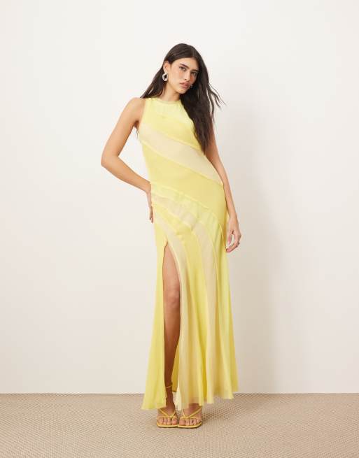 ARRANGE – Gul, panelsydd maxiklänning med råskurna kanter och brottarringning