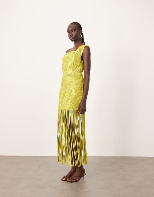 ARRANGE – Limegrön, asymmetrisk miniklänning med texturerat mönster och fransfåll