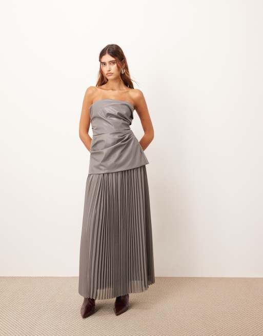 ARRANGE – Mörkgrå maxiklänning med liv av PU och plisserad kjol