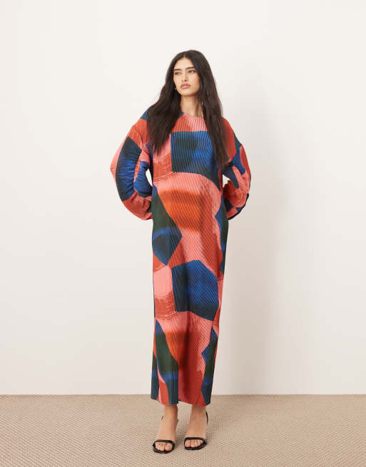 ARRANGE – Plisserad maxiklänning med ballongärmar och abstrakt mönster