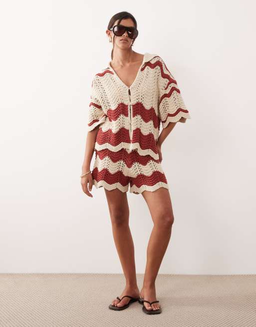 ARRANGE – Rostfärgade och beige, randiga, virkade shorts, del av set