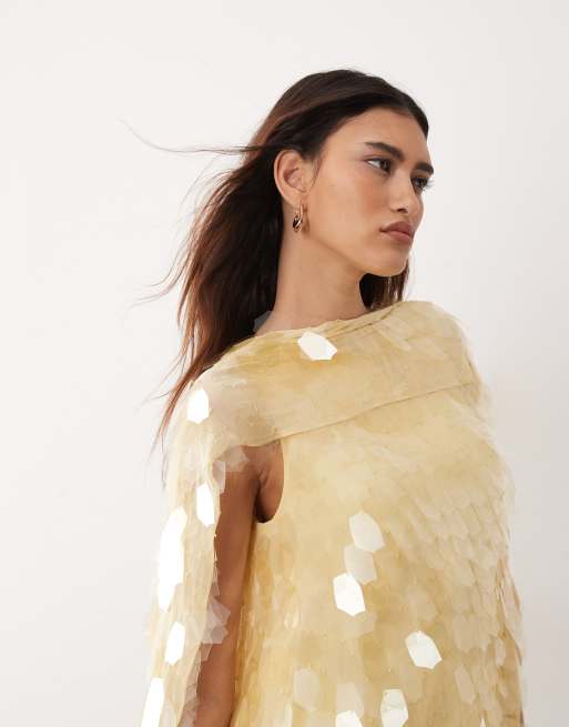 ARRANGE – Smörgul, draperad topp med hög krage och utsmyckade paljetter