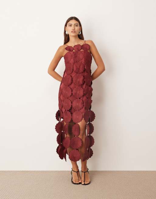 ARRANGE – Vinröd midiklänning med utskurna blommor och fransad fåll