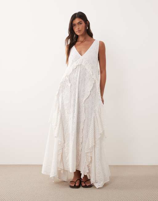 ARRANGE – Vit maxiklänning i broderie anglaise med volang och v-ringning