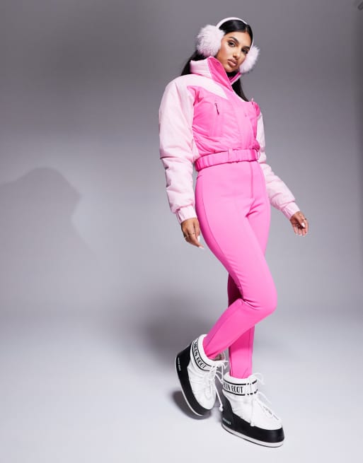 4505 – Skidåkning – Rosa, vattenavvisande, isolerad skidoverall med blockmönster i retrostil