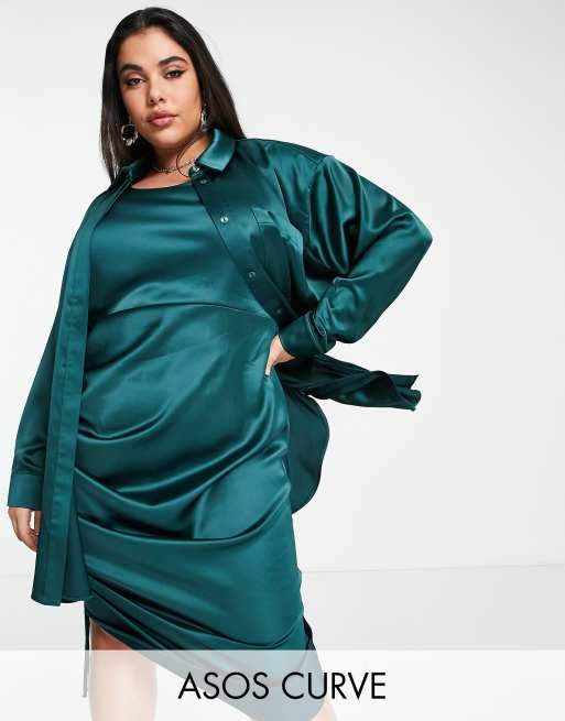 ASOS DESIGN Curve – Blågrön skjorta i satin och oversize, del av set