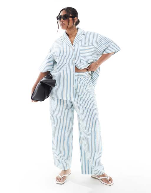 ASOS DESIGN Curve – Blårandiga byxor i bäckebölja med elastisk midja och barrelben, del av set