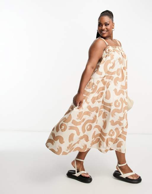 ASOS DESIGN Curve – Brun, abstrakt mönstrad, a-linjeformad sommarklänning i midilängd med hängslen av bomull