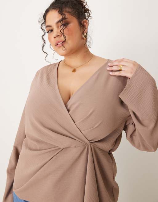 ASOS DESIGN Curve – Brun, långärmad topp med omlottdetalj