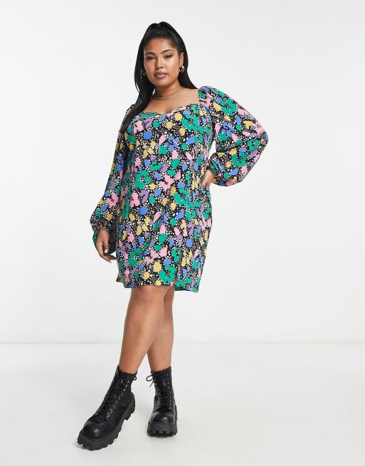 ASOS DESIGN Curve – Flerfärgad, fläckmönstrad klänning i minilängd med volymärmar