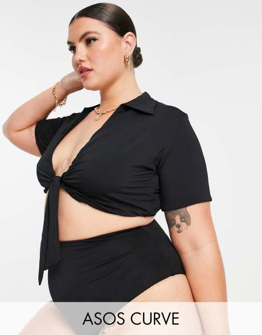 ASOS DESIGN Curve – Glansig svart bikiniöverdel i kort design med krage och knytning framtill