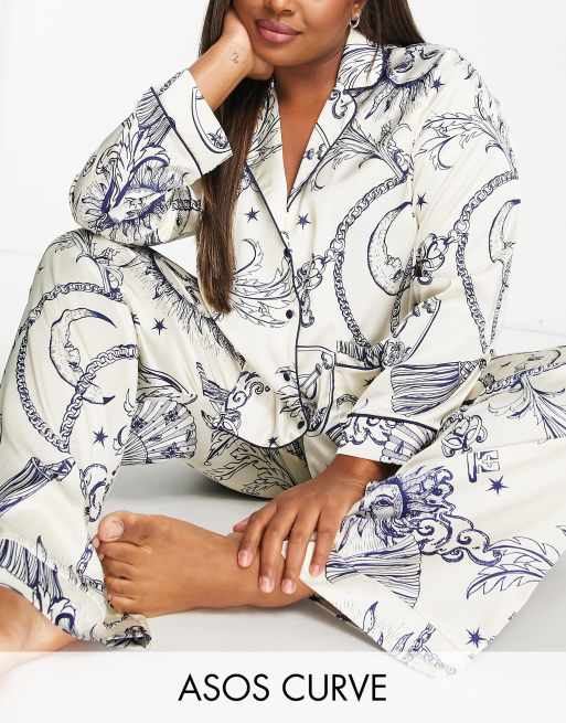 ASOS DESIGN Curve – Gräddvit och marinblå, barockmönstrad pyjamas med skjorta och byxor av satin