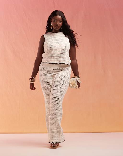 ASOS DESIGN Curve – Gräddvitt, stickat set med linne och byxor med utsvängd design och kantband