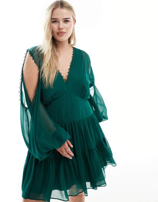 ASOS DESIGN Curve – Grön panelsydd cold shoulder-miniklänning med spetsinslag