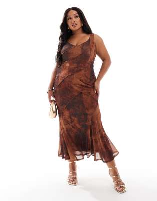 ASOS DESIGN Curve – Gul mönstrad midiklänning i mesh med djup halsringning och synliga sömmar
