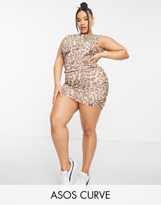ASOS DESIGN Curve – Leopardmönstrad ärmlös miniklänning i ryschad mesh