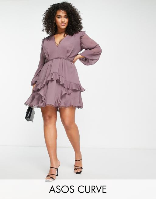 ASOS DESIGN Curve – Lila miniklänning med lång ärm och rundad nederkant