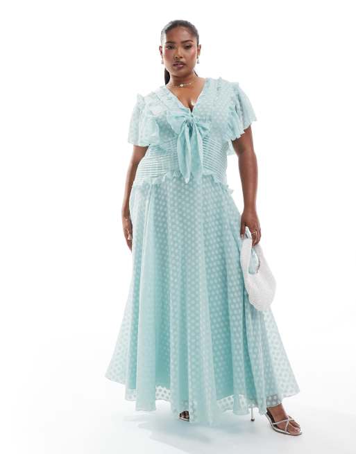 ASOS DESIGN Curve – Ljusblå, jacquardvävd midiklänning med devoréprickar, utsvängda ärmar och knytning framtill