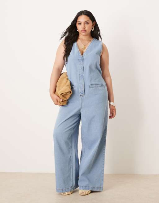 ASOS DESIGN Curve – Ljusblå, tvättad, ärmlös jumpsuit i denim med knytning