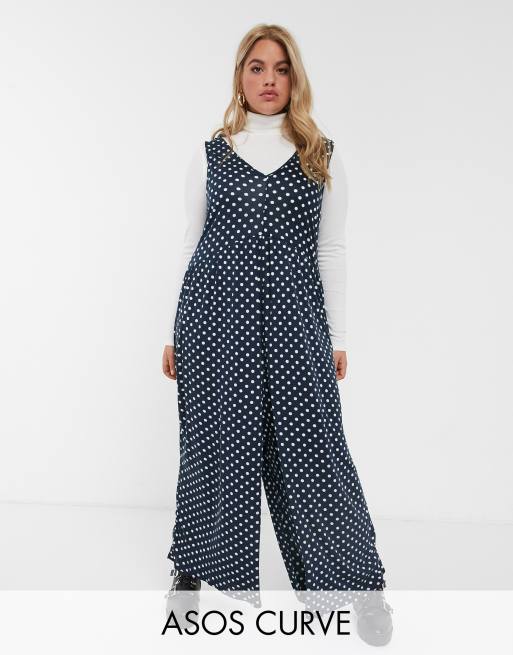 ASOS DESIGN Curve – Marinblå prickig mysjumpsuit i smockmodell