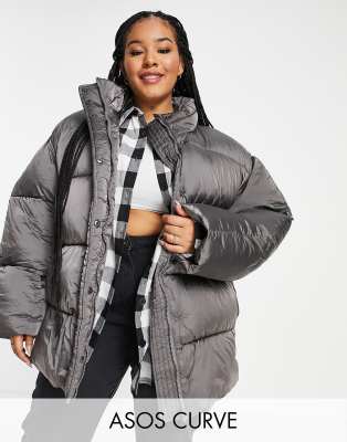 ASOS DESIGN Curve – Mörkgrå, glansig pufferjacka i oversize modell