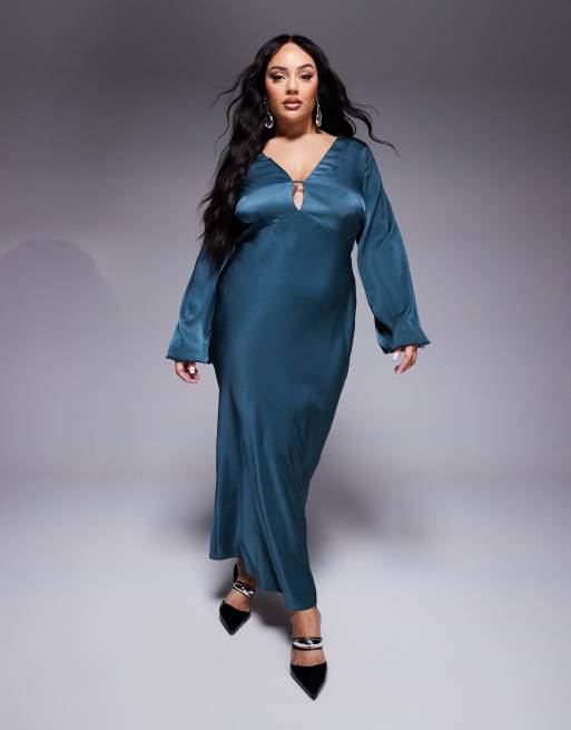 ASOS DESIGN Curve – Mörkt blågrön midaxiklänning i satin med v-ringning och blusärmar