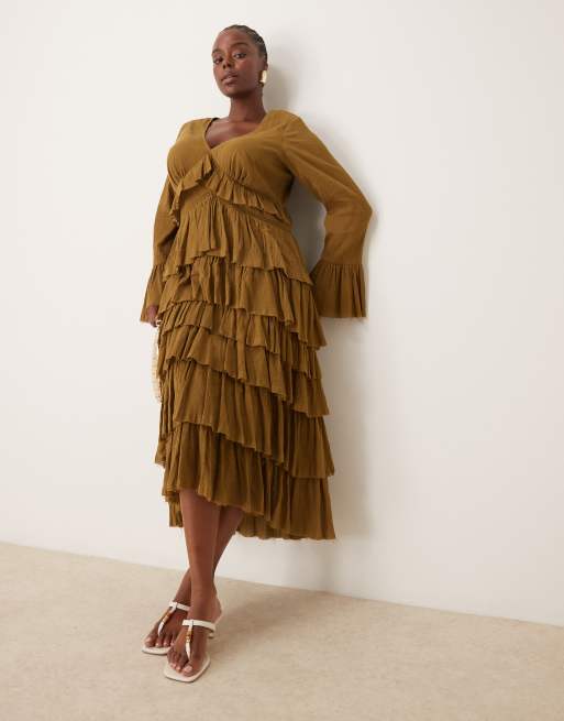 ASOS DESIGN Curve – Olivfärgad miniklänning med v-ringning, spetsdetaljer och panelsydd kjol