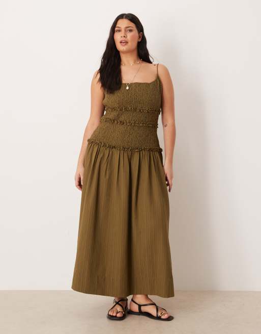 ASOS DESIGN Curve – Olivgrön, krinklad maxiklänning med sänkt, smockad midja