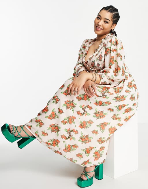 ASOS DESIGN Curve – Rödblommig midi-smockklänning med smockade ärmslut