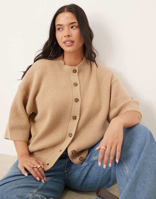ASOS DESIGN Curve – Sandfärgad, ribbstickad kofta med korta ärmar