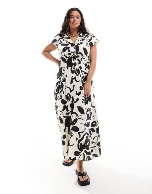 ASOS DESIGN Curve – Skjortklänning i linne och midilängd med holkärmar, stråveck och abstrakt mönster