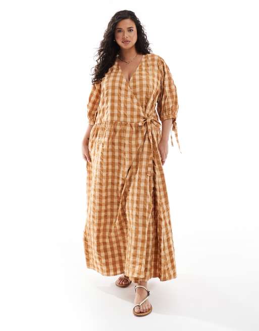 ASOS DESIGN Curve – Stenfärgad ginghamrutig smockklänning i midilängd med omlottdesign