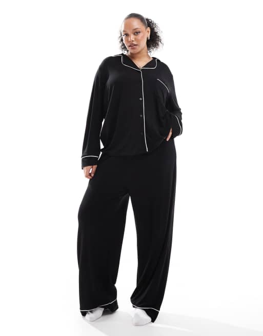ASOS DESIGN Curve – Svart, extra mjuk pyjamas med långärmad skjorta och byxor med kontrastfärgade kantband