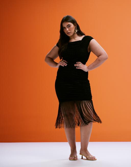 ASOS DESIGN Curve – Svart midiklänning med asymmetrisk ringning, textur och fransfåll