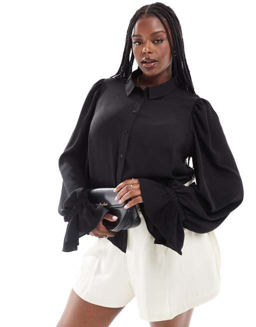 ASOS DESIGN Curve – Svart mjuk skjorta med volymärmar och volanger vid manschetterna