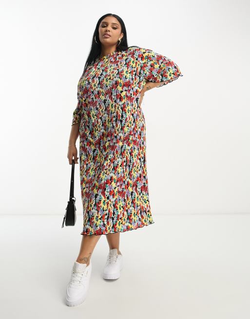 ASOS DESIGN Curve – Svart och lila t-shirtklänning i midilängd med plissering och blommigt mönster