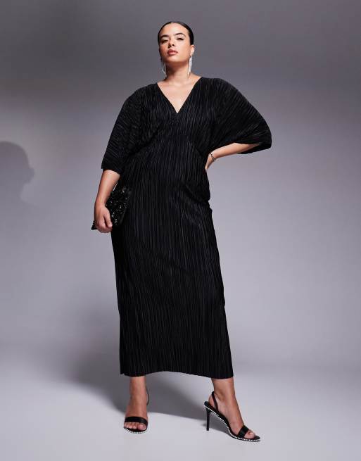 ASOS DESIGN Curve – Svart, plisserad midiklänning med v-ringning och pingvinärmar