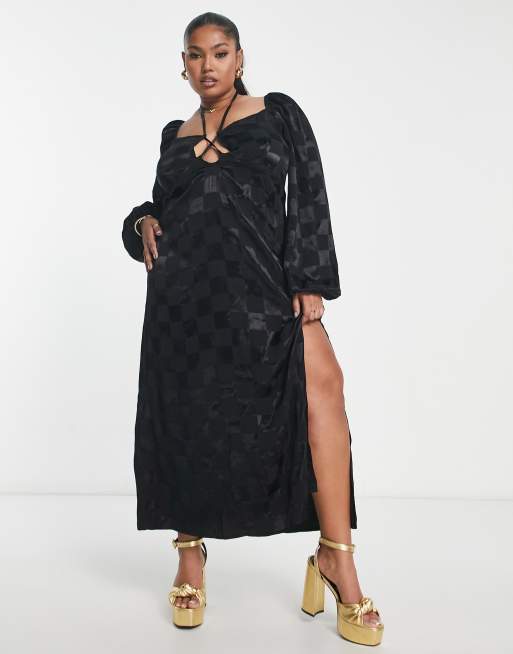 ASOS DESIGN Curve – Svart, schackrutig midiklänning med knytning vid halsen av jacquardvävd satin