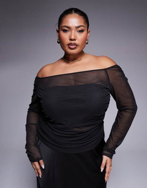 ASOS DESIGN Curve – Svart topp i mesh med bara axlar och rynkade detaljer