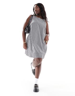 ASOS DESIGN Curve – Svartvit, ginghamrutig sundress i vid modell, minilängd och linnetyg med hög halsringning