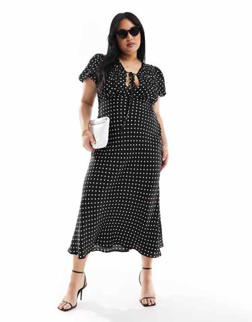 ASOS DESIGN Curve – Svartvit, prickig midiklänning med rynkning, knytning och livdetalj