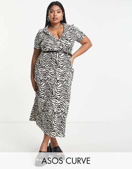 ASOS DESIGN Curve – Svartvit, zebrarandig omlottklänning i midilängd med skärp och korta ärmar