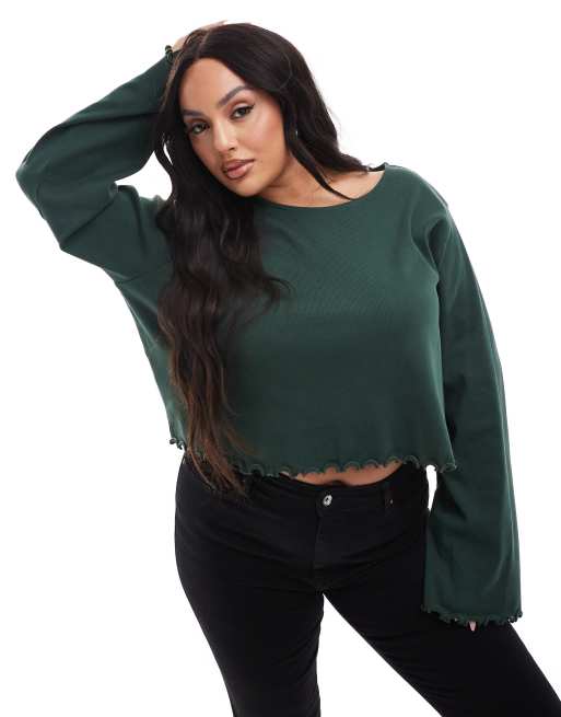 ASOS DESIGN Curve – Tallbarrsgrön t-shirt med lång ärm och vågig kant