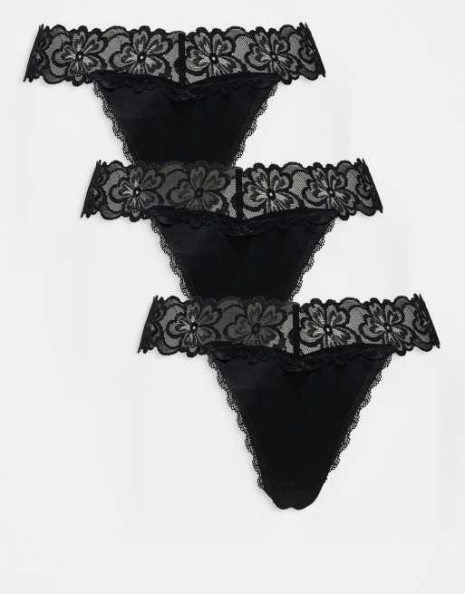 ASOS DESIGN – Minnie – Svarta stringtrosor i bomull med midjeband i spets, 3-pack