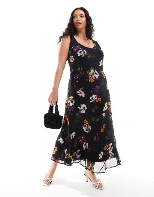 ASOS DESIGN – Mörk, blommig, midilång slipklänning i chiffong med djup halsringning