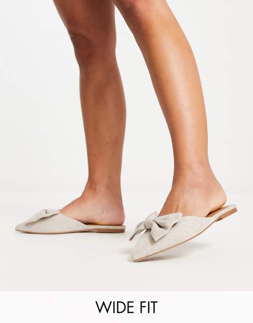 ASOS DESIGN Wide Fit – Lass – Spetsiga platta mules i naturligt material med stora rosetter