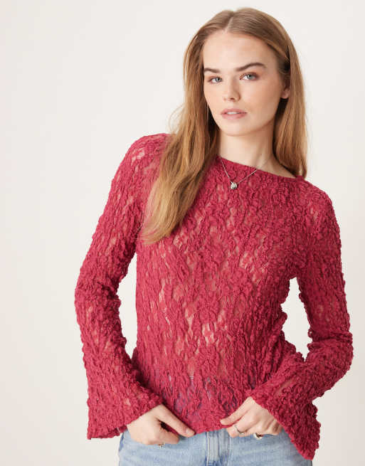AS0S DESIGN – Hallonröd topp i skir spets med rak halsringniing och utsvängda ärmar