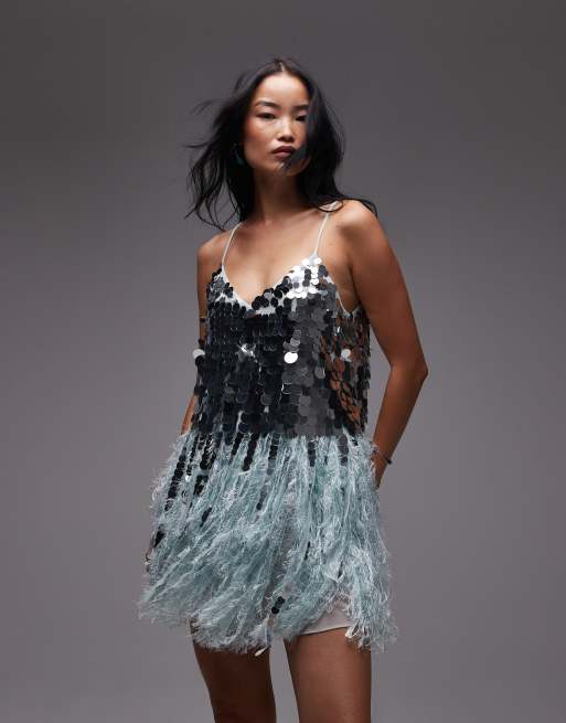 ASOS ARCHIVE – Blå miniklänning med paljetter och fuskfjäderfåll
